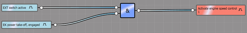 The following logic diagram makes it possible to increase the engine speed to a preset value. When the EG power take-off is connected engine speed 1 will be activated.