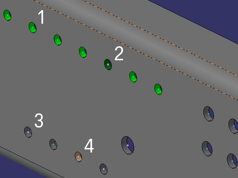 - Donkergroen geeft referentiegaten voor bestaande steunen van de fabriek aan.